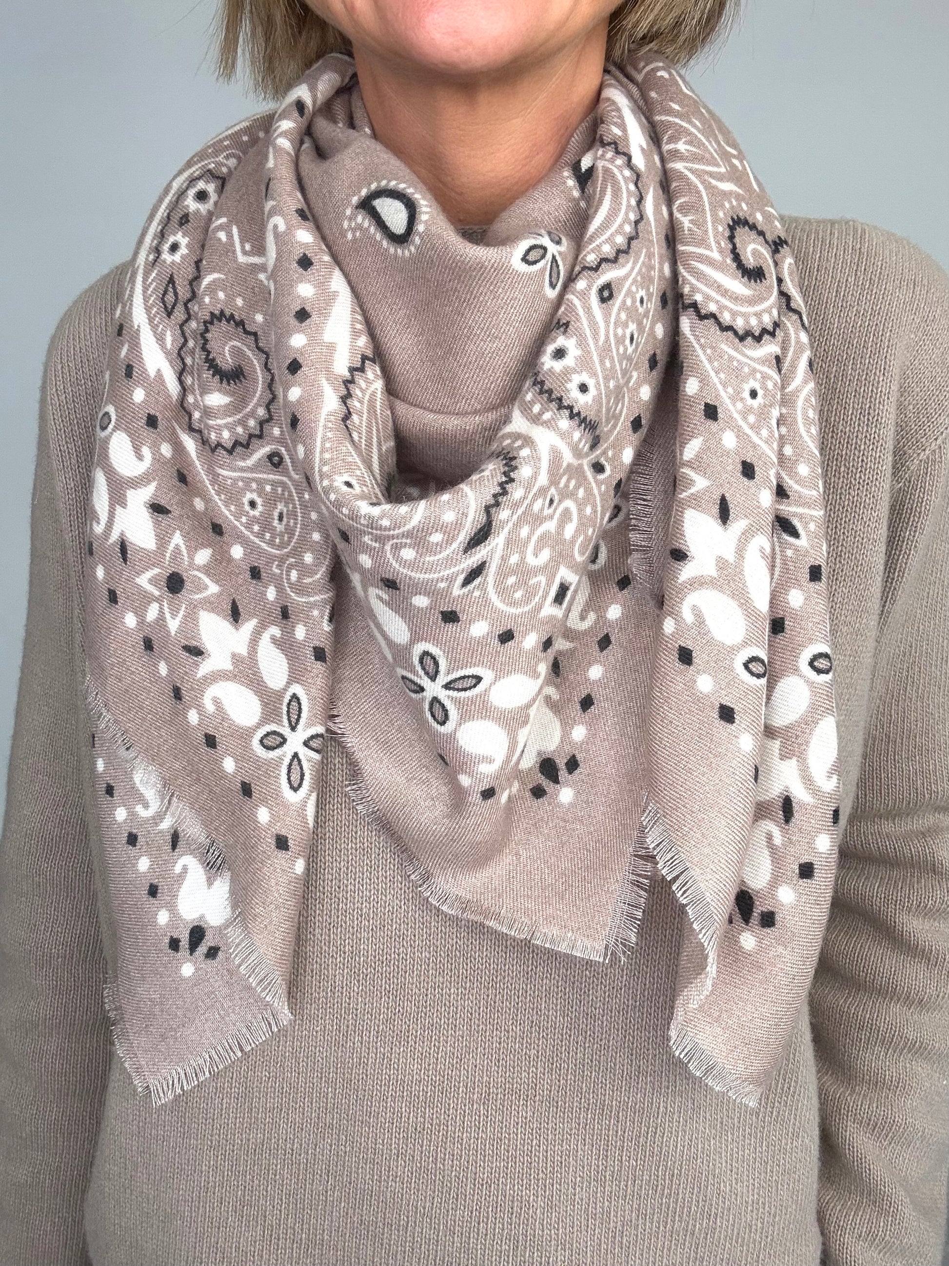 EVERYONE was wearing a bandana scarf when we were last in Paris. And it was love at first sight for us. We have them available in 5 colours and they are roughly 100cm x 100cm. They are a soft mix of brushed cotton and viscose and go so nicely with our new 100% wool jumpers. We are sure you are going to love them too.