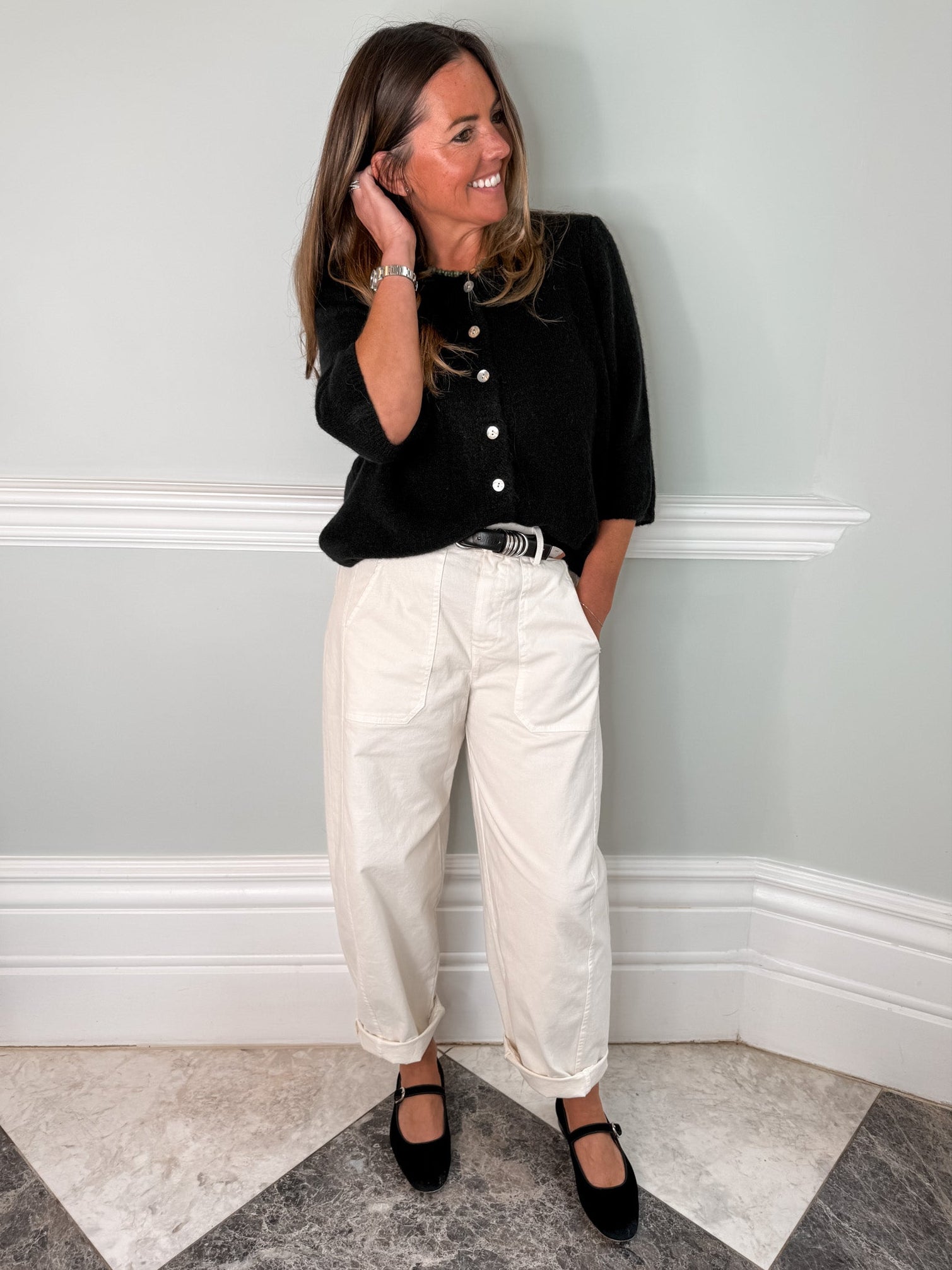 This cardigan is a lovely soft alpaca blend with zero itch factor! It is a really easy everyday wardrobe staple and we love wearing it with our barrel leg jeans or wide leg jeans as the length is shorter than some of our other knitwear. It This is one size only and is a boxy fit, and we all LOVE it. The sleeves are 3/4 length.