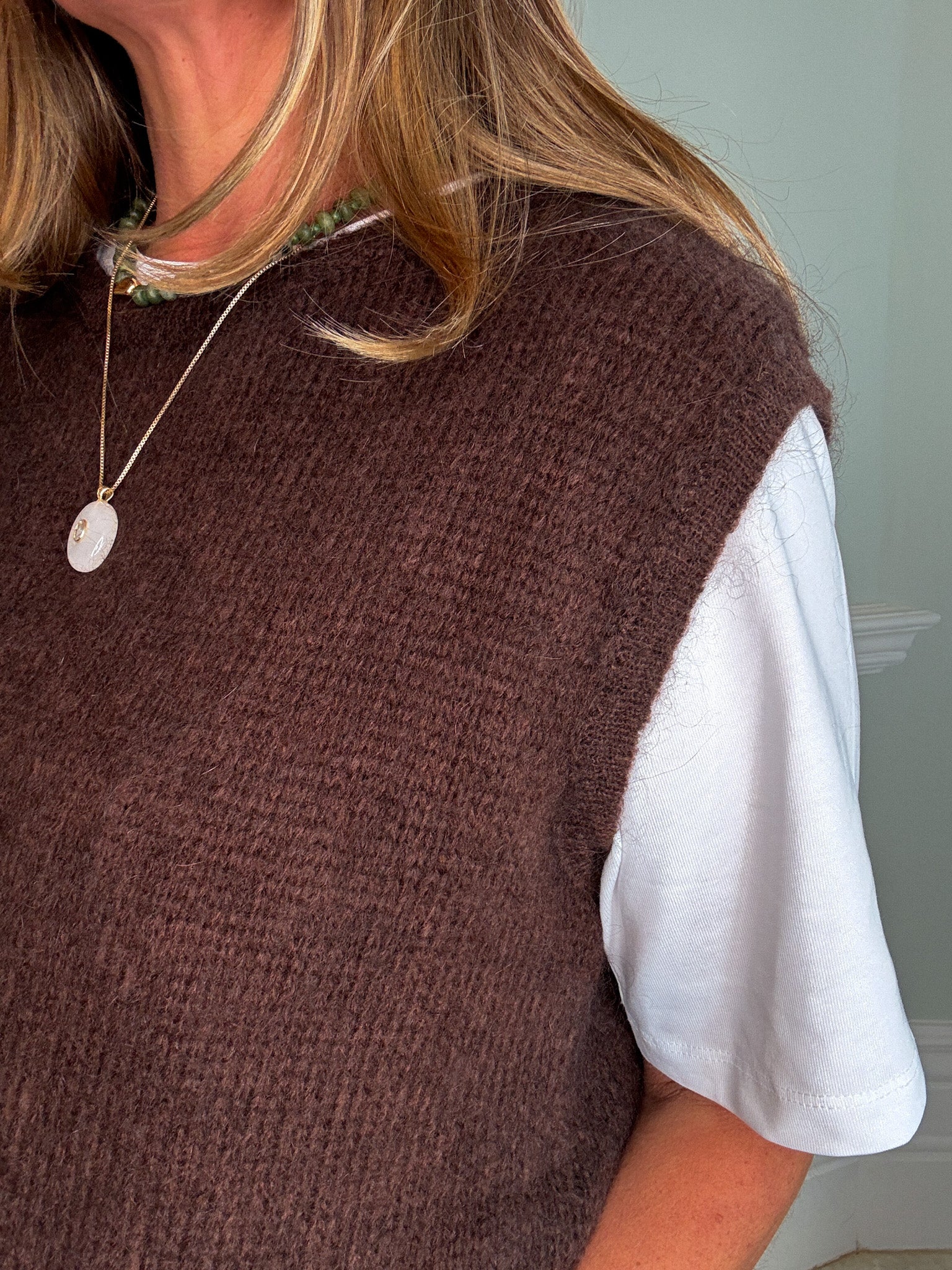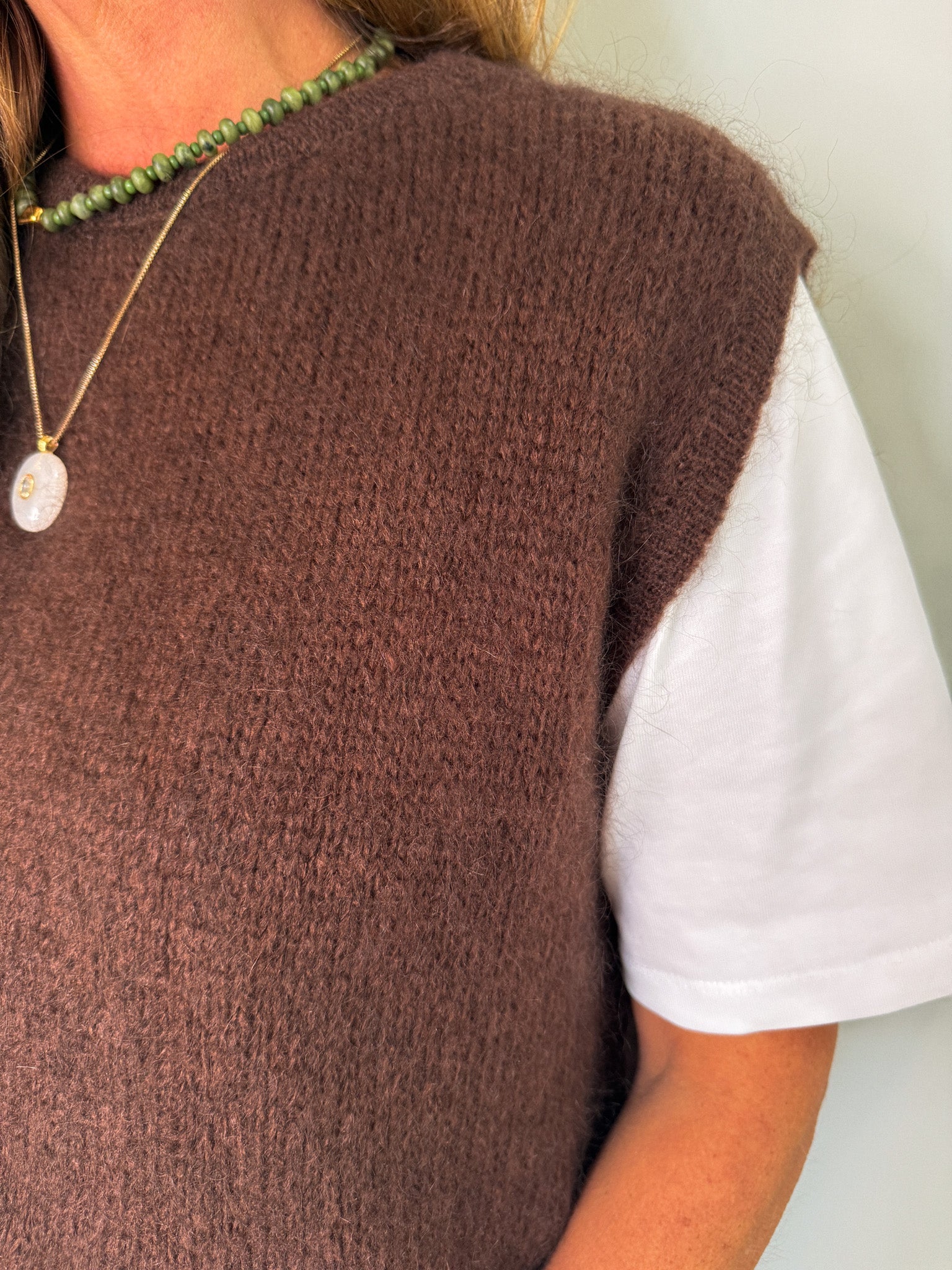 We love a sleeveless knit. This mohair blend is a goodie. It is available in chocolate brown and navy blue and is available in one size. We think it is best fit on a UK 10-14.