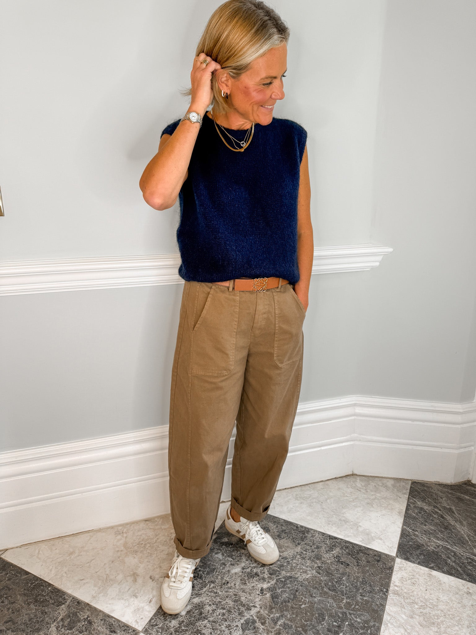 We love a sleeveless knit. This mohair blend is a goodie. It is available in chocolate brown and navy blue and is available in one size. We think it is best fit on a UK 10-14.