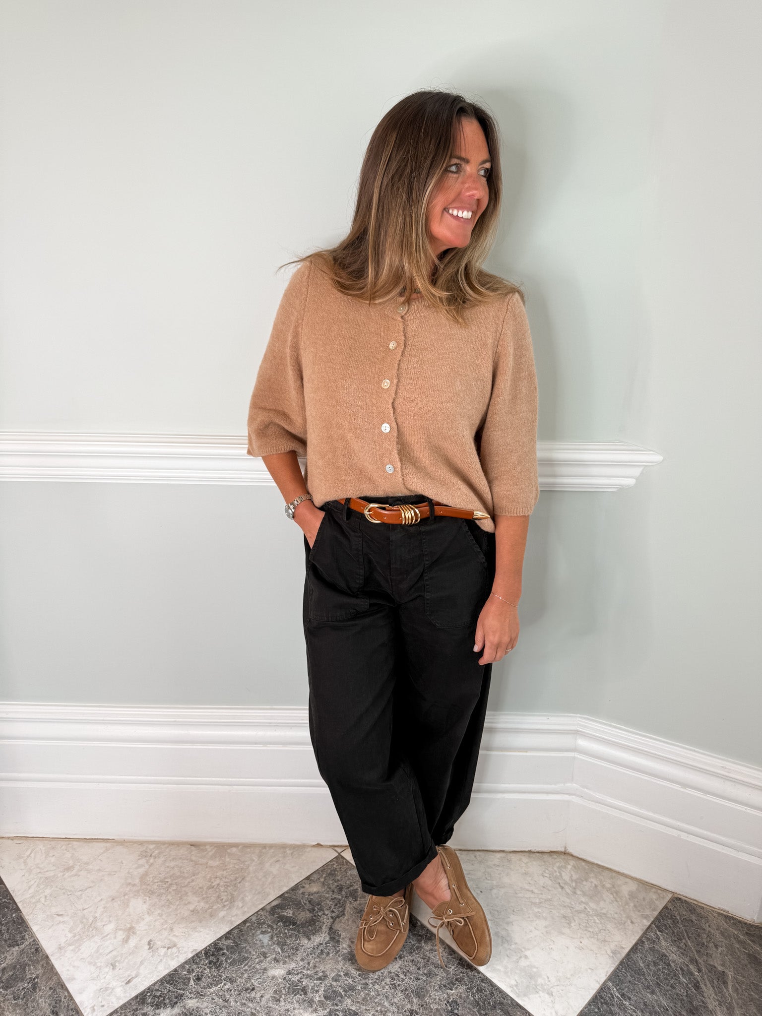 This cardigan is a lovely soft alpaca blend with zero itch factor! It is a really easy everyday wardrobe staple and we love wearing it with our barrel leg jeans or wide leg jeans as the length is shorter than some of our other knitwear. It This is one size only and is a boxy fit, and we all LOVE it. The sleeves are 3/4 length.