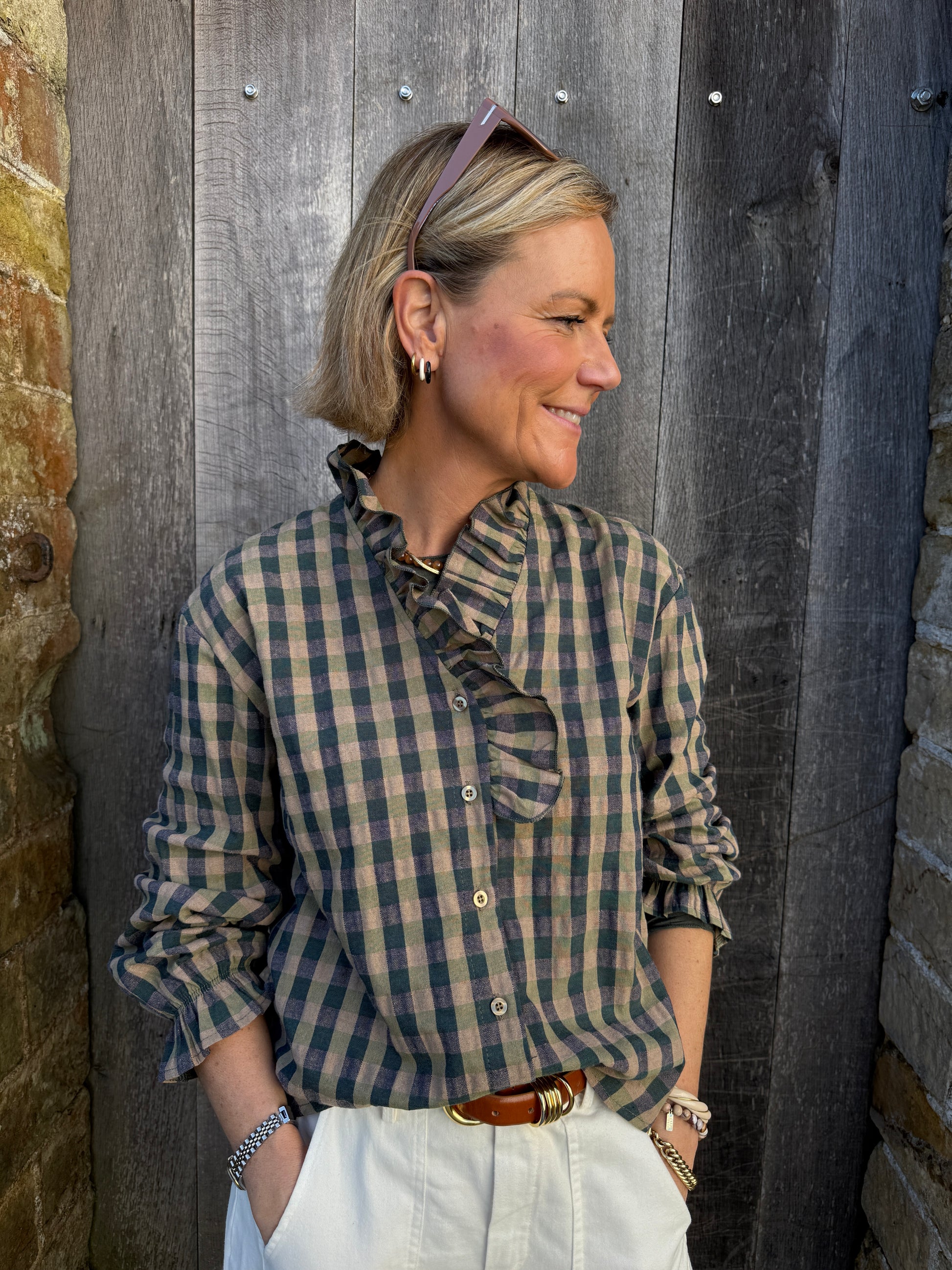 We love a check and this shirt is a lovely muted green and neutral toned check fabric. The ruffle cotton blend blouse looks great worn with your jeans or our cream barrel leg trousers. We love the high frill collar as you can wear our new khaki insider underneath it as an extra layer. It also sits nicely under a cardigan with the frill exposed. It has full length sleeves with an elastic frill cuff so you can wear the sleeves at 3/4 length too.