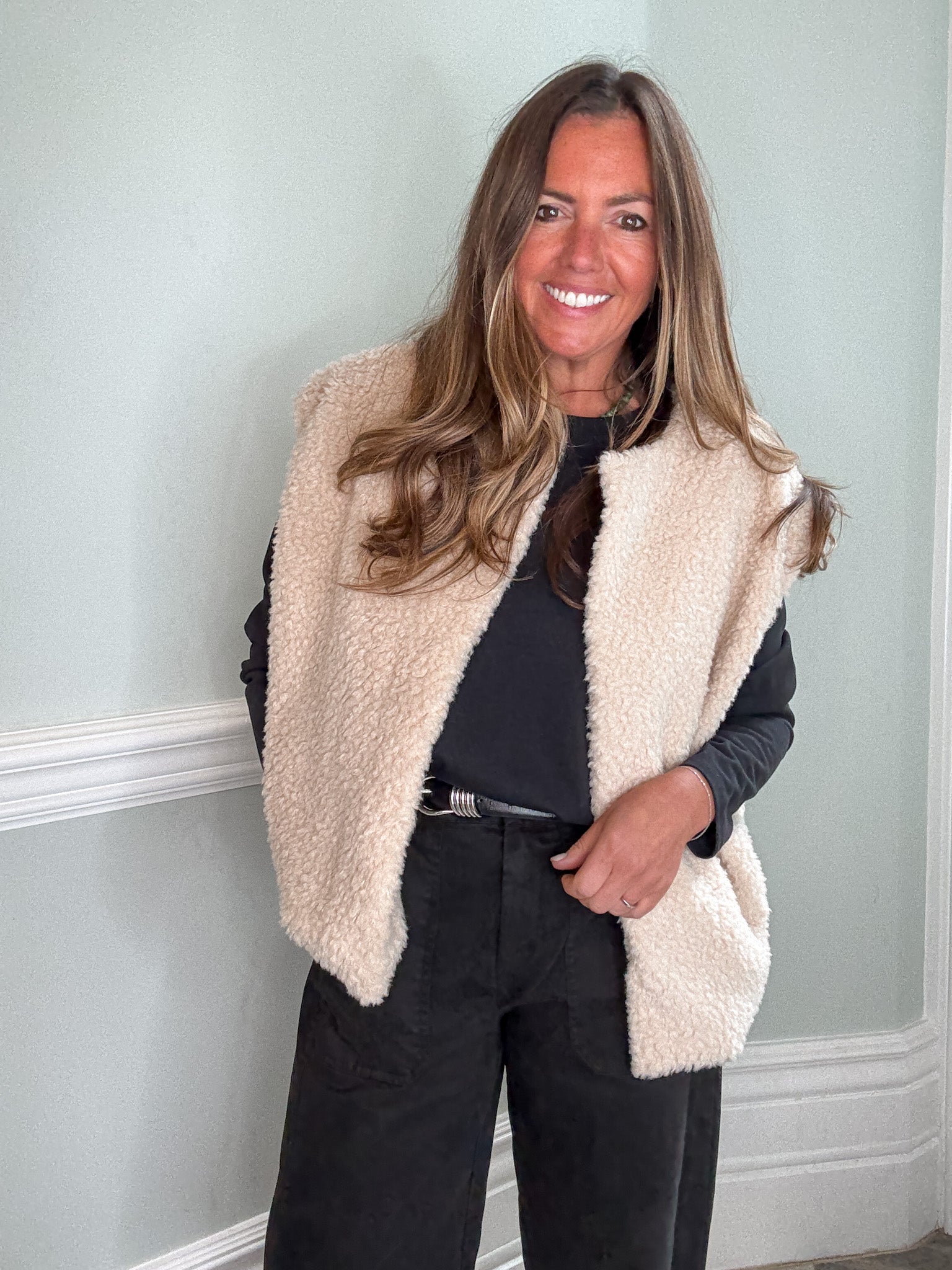 Our Cream Faux Shearling Vest is a versatile piece designed to add both warmth and texture to your look. It's a lovely soft faux shearling with a cozy, teddy-style finish, this sleeveless design features a clean open front and a striped inner lining. It is a slouchy oversized fit so perfect for wearing over your knitwear.
