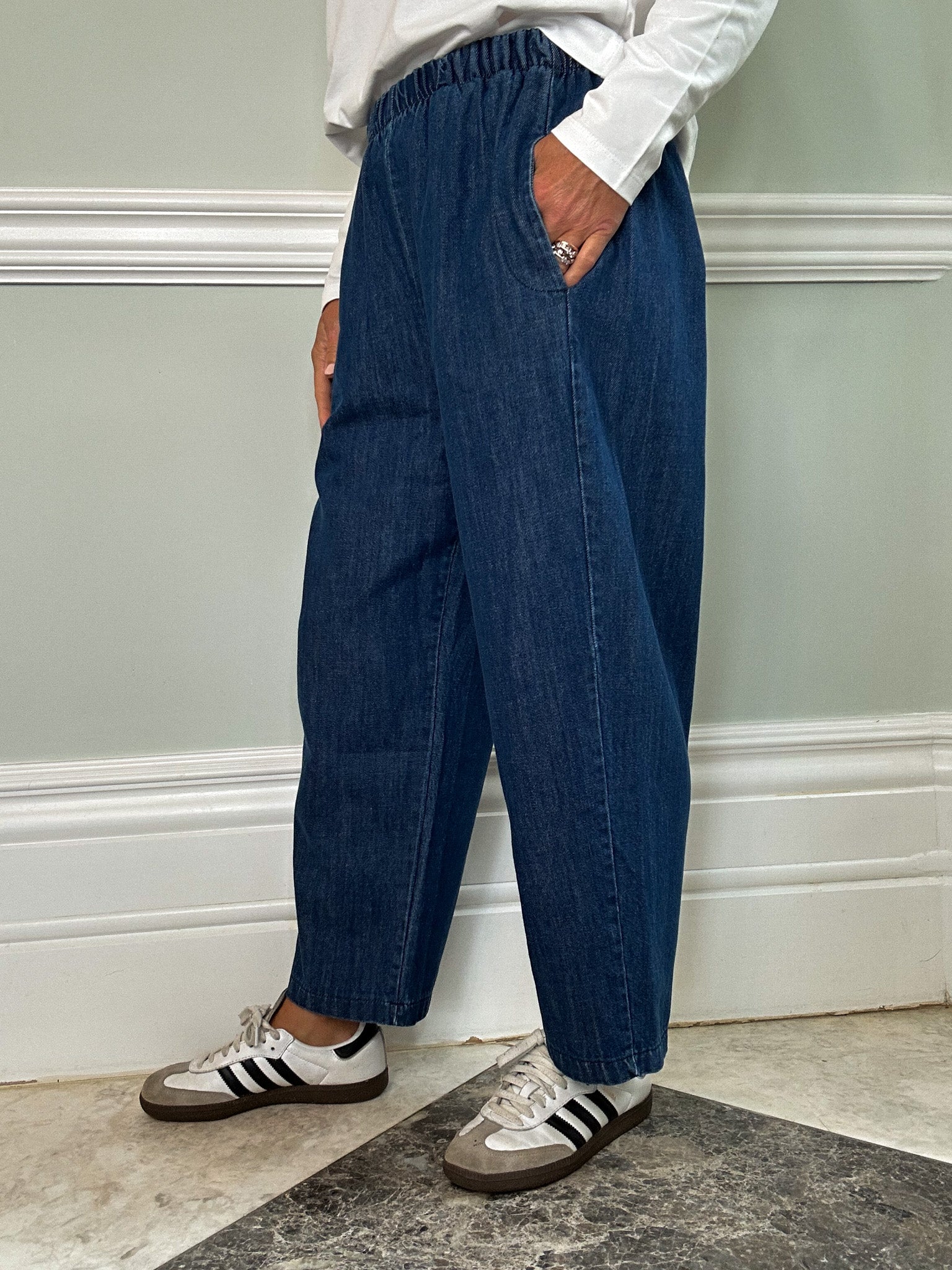 These mid blue denim trousers are a goodie. They are a perfect denim, not too dark and not too light and literally go with anything. They are super comfortable and seem to fit everybody! They are one size and we think they fit well on a size 10-16. They are 100% cotton and the leg shape is slightly tapered and similar to a slight barrel leg. The waist is elasticated.