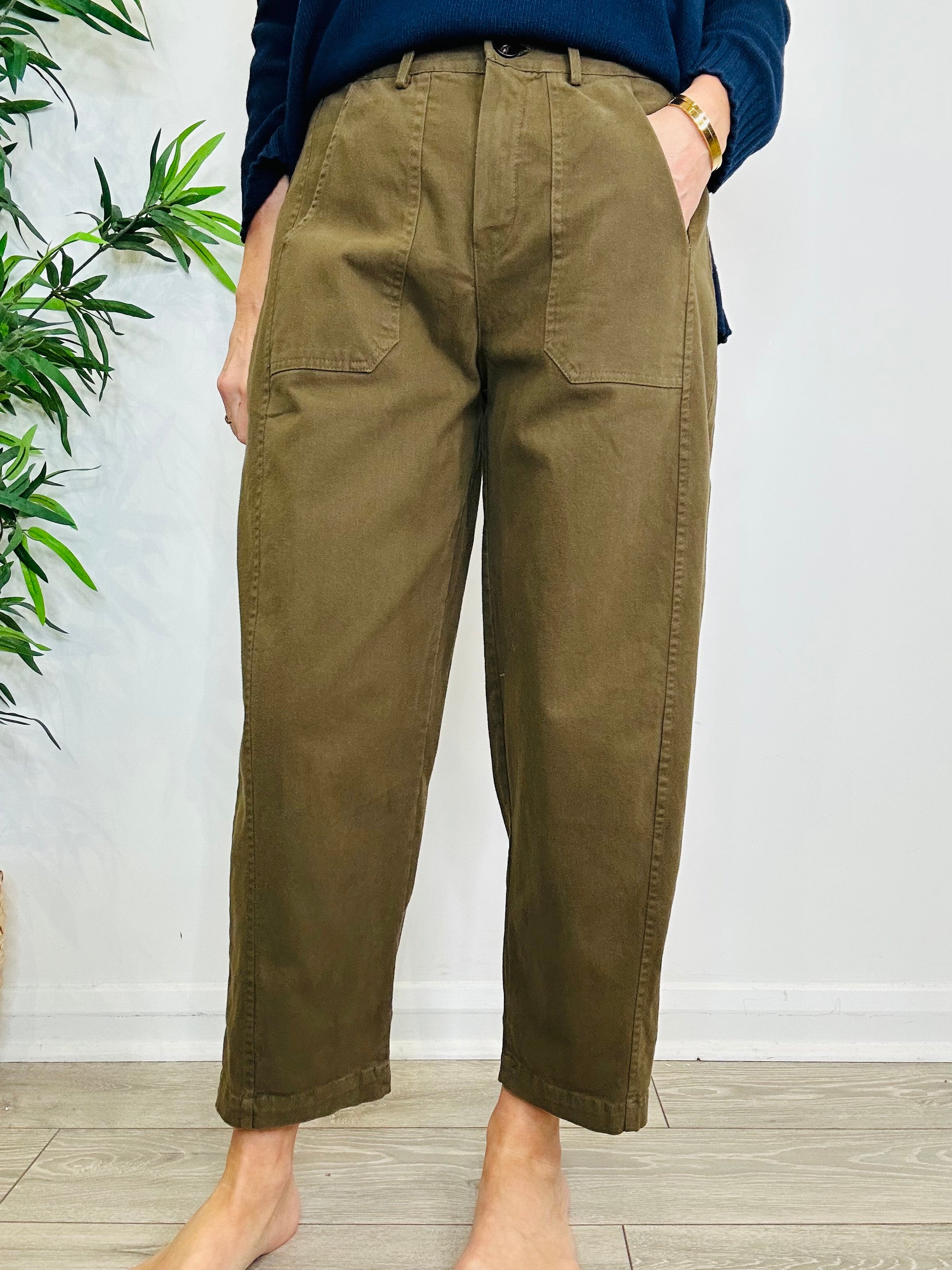 Our barrel leg trousers are AMAZING. They are cut to a modern barrel leg silhouette. They sit mid rise and we like wearing them with one or two turn ups at the ankle. They are elasticated at the back of the waist so they are super comfortable but with a flat button fastening front so that a belt sits nicely on them.