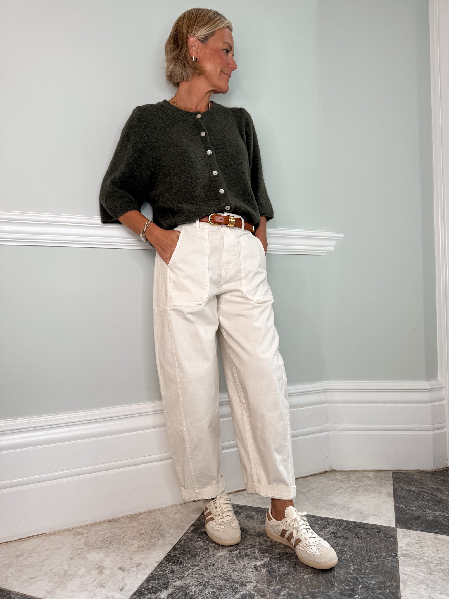 This cardigan is a lovely soft alpaca blend with zero itch factor! It is a really easy everyday wardrobe staple and we love wearing it with our barrel leg jeans or wide leg jeans as the length is shorter than some of our other knitwear. It This is one size only and is a boxy fit, and we all LOVE it. The sleeves are 3/4 length.