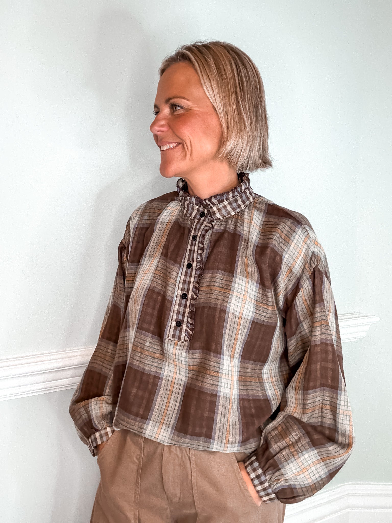 This chocolate checked blouse is crafted from lightweight, breathable dual layer cotton in a chocolate, grey, soft yellow print and it features a contrasting check on the yolk and cuffs. The relaxed shape make it perfect for dressing up or down, whether you're styling it with denim or layering it under knits.