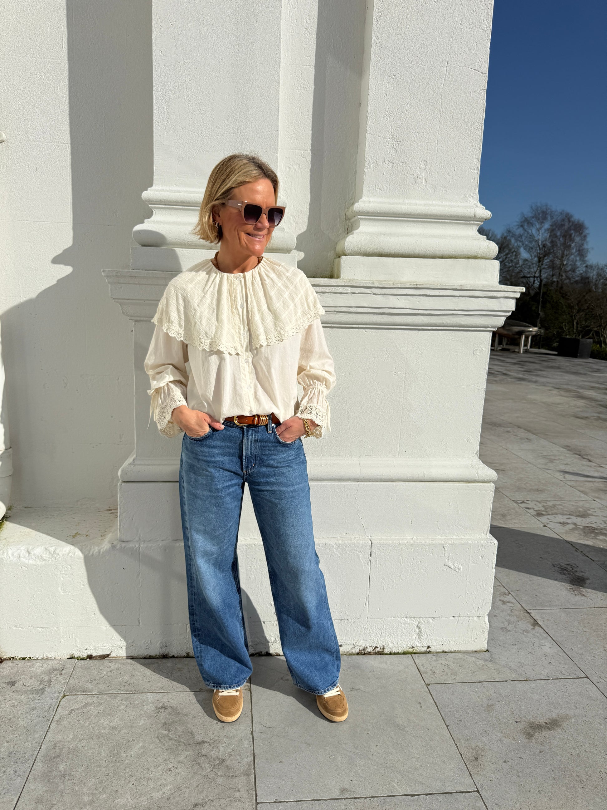 It looks so good with your jeans and just makes your outfit feel a little bit prettier and feminine. Plus you can wear it now with our cream insider as an extra layer to keep you warm!