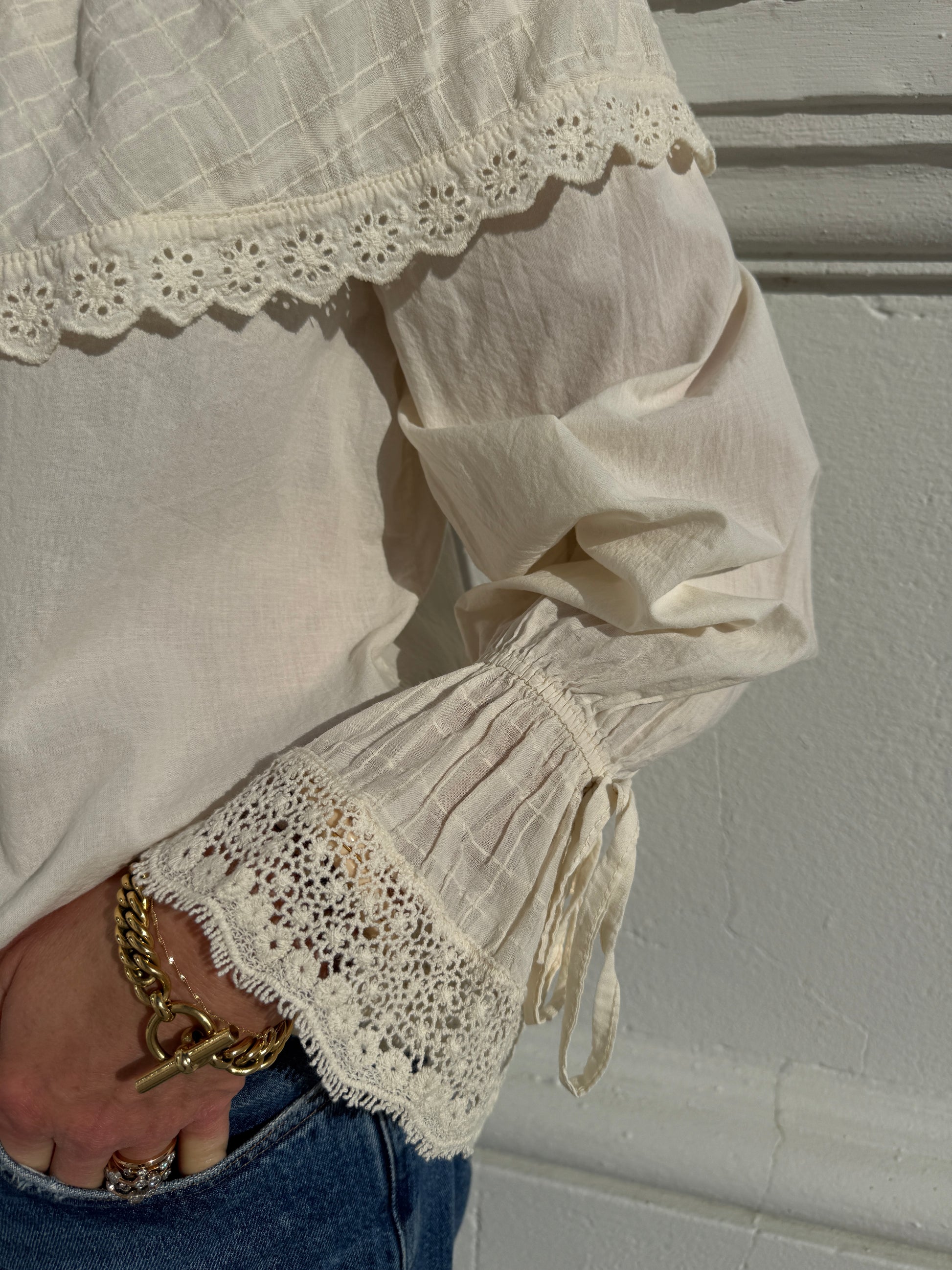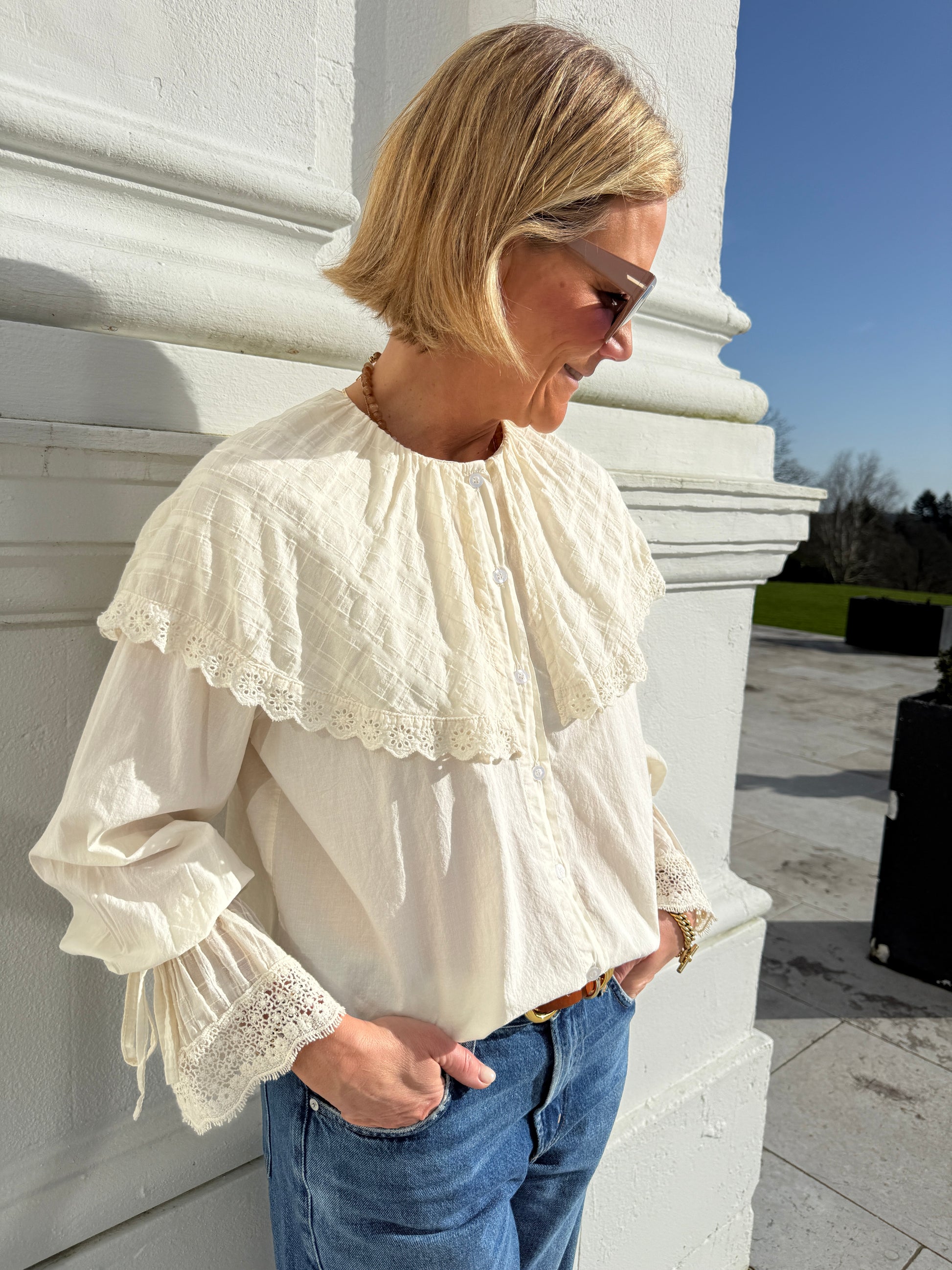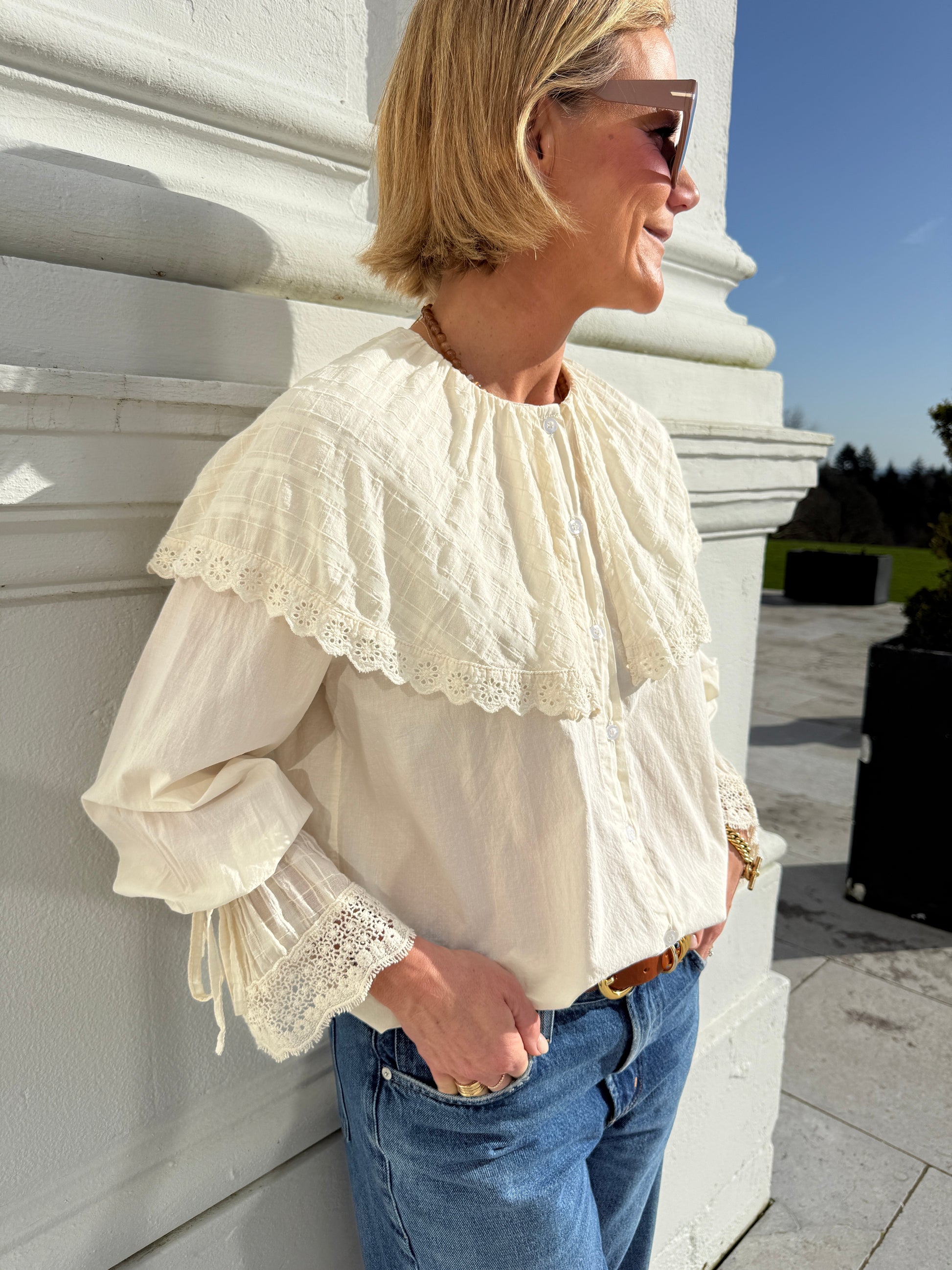 This soft cotton blouse has such a romantic, 'Wuthering Heights' feel to it. Crafted in a soft ivory cotton, it features a delicate oversized lace-trimmed collar, button-down front, and gently gathered sleeves with intricate lace cuffs.