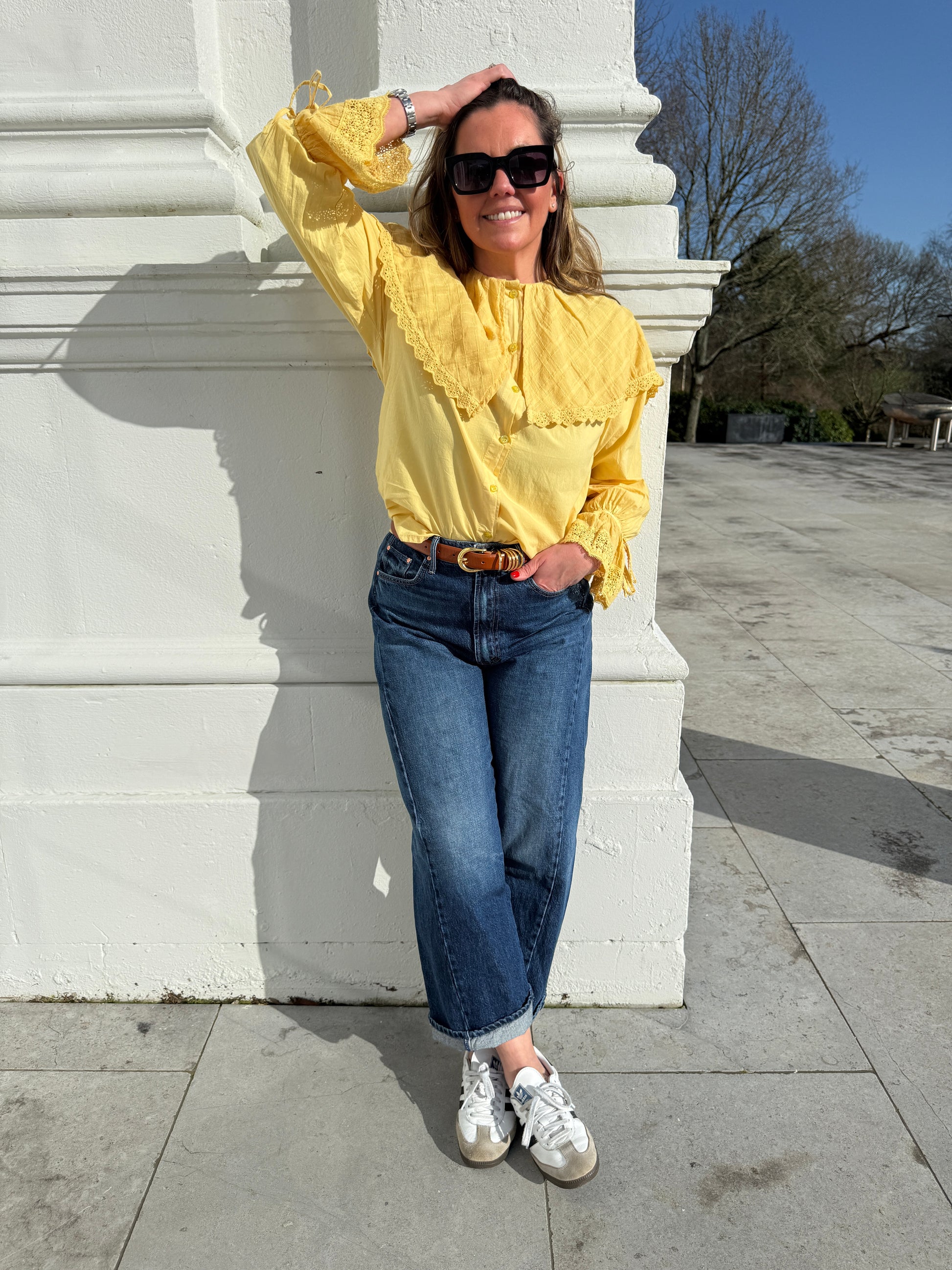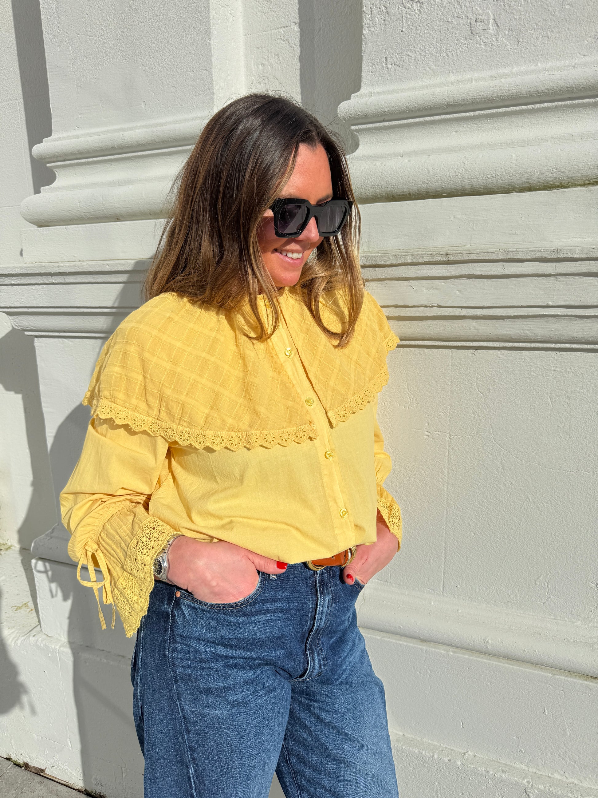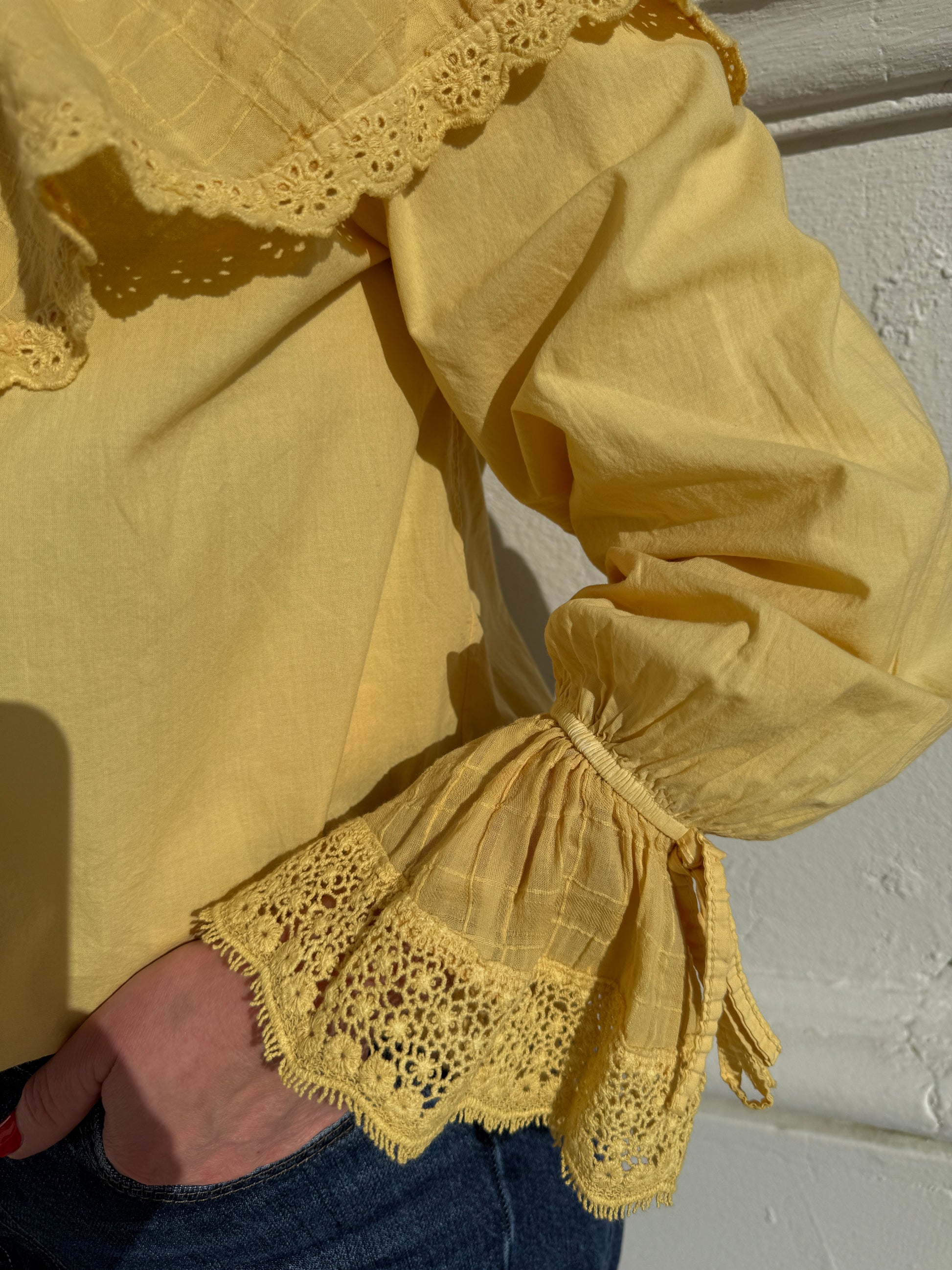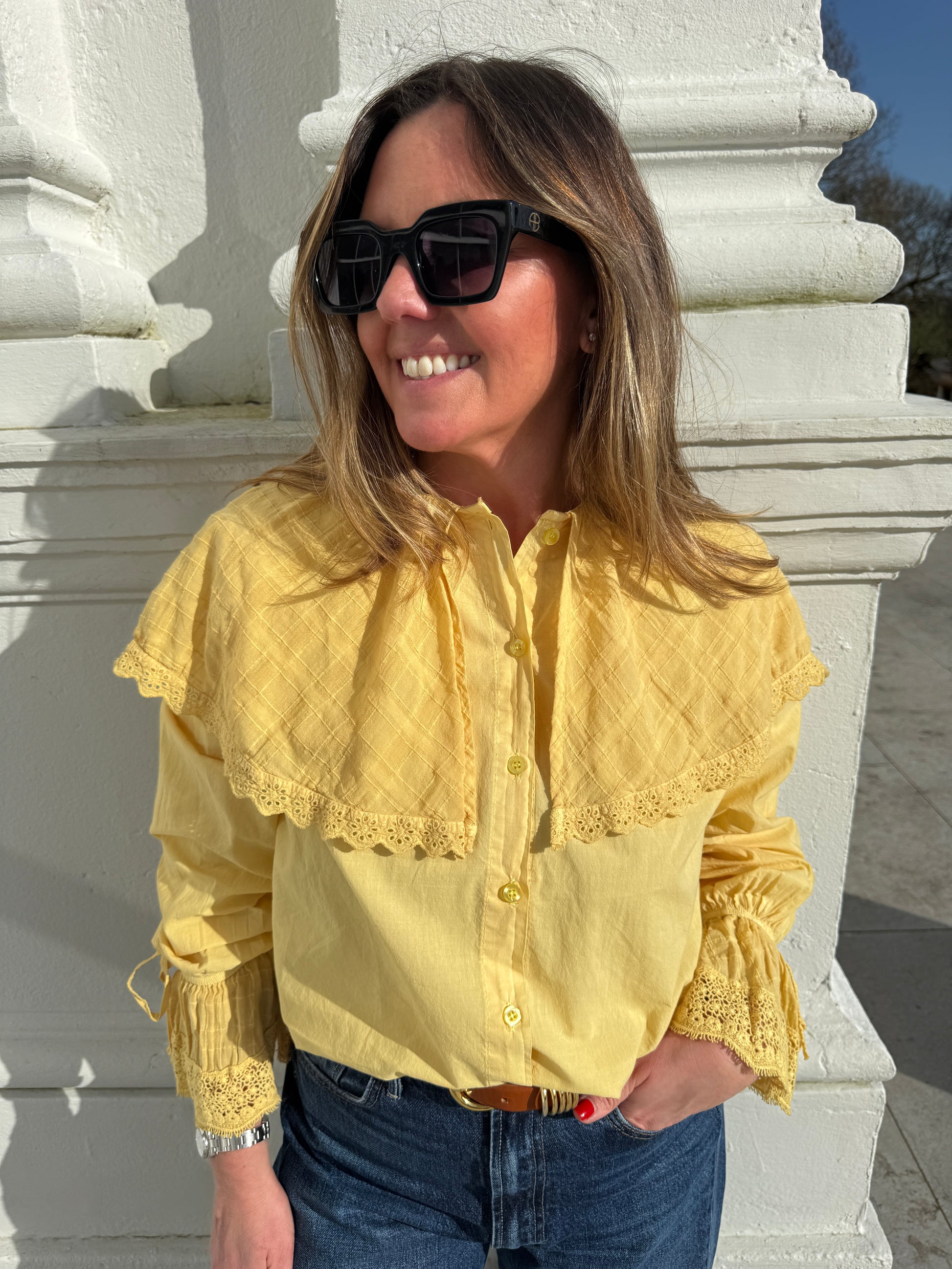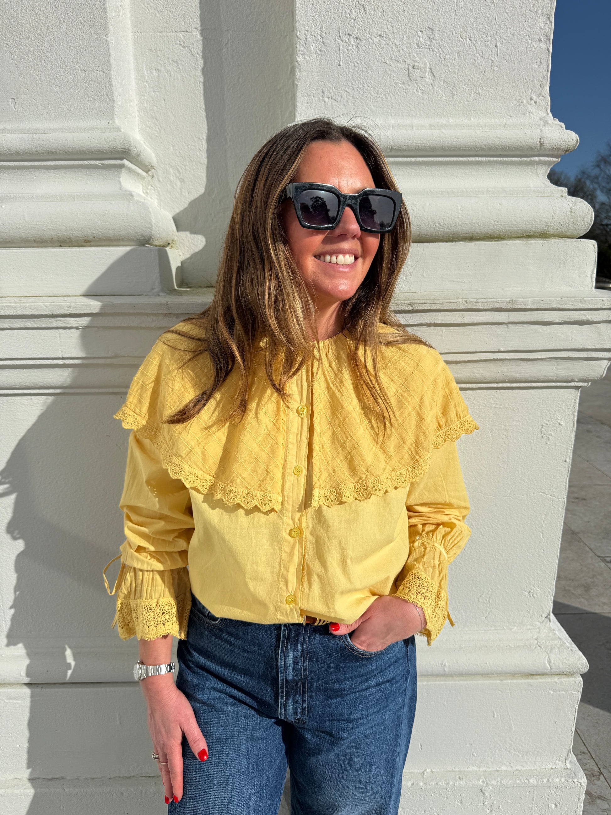 This soft cotton blouse has such a romantic, 'Wuthering Heights' feel to it. Crafted in a soft sunshine yellow cotton, it features a delicate oversized lace-trimmed collar, button-down front, and gently gathered sleeves with intricate lace cuffs.