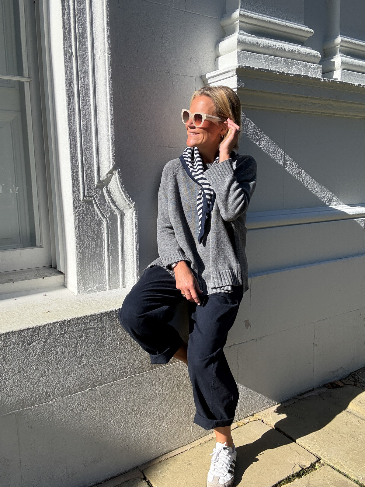 Add this navy and grey striped colour with one of our grey knit jumpers or with a white tee and a pair of our navy or cream barrel trousers and you are good to go.